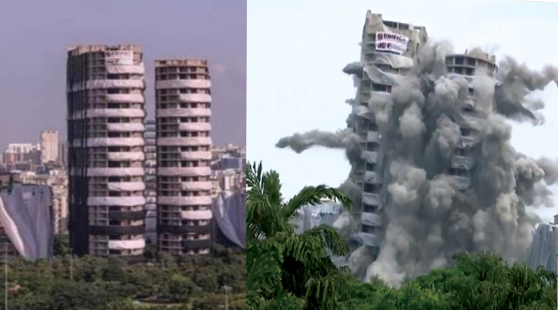 রবিবার দুপুর ২.৩০নাগাদ বিস্ফোরণ ঘটিয়ে ভেঙে ফেলা হয় এই গগনচুম্বী জোড়া অট্টালিকা। এই কাজের জন্য ৩ হাজার ৭০০ কেজি বিস্ফোরক ব্যবহার করা হয়েছিল। ওই সময় বিস্ফোরণের রিমোট ছিল হরিয়ানার হিসারেরর বাসিন্দা চেতন দত্তের হাতে। তিনি বোতাম টিপতেই শুরু হয় বিস্ফোরণ। তাতেই ভেঙে পড়ে জোড়া বহুতল ভবন । গত বছর এই জোড়া বহুতল ভবন ভাঙার নির্দেশ দিয়েছিল সুপ্রিম কোর্ট। সেই মতো এদিন ভেঙে ফেলা হয় বেআইনি নির্মাণ।