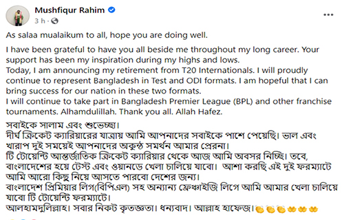 Today, I am announcing my retirement from T20 Internationals. I will proudly continue to represent Bangladesh in Test and ODI formats. I am hopeful that I can bring success for our nation in these two formats.