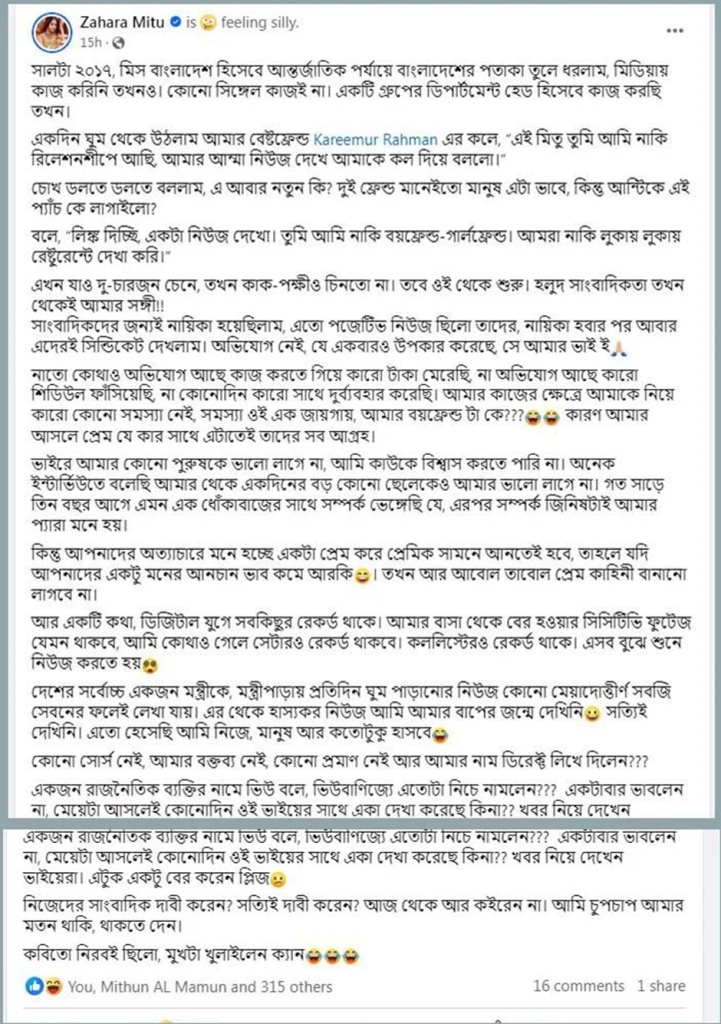 স্বৈরাচারী আওয়ামী লীগের সাবেক সাধারণ সম্পাদক ও সেতুমন্ত্রী ওবায়দুল কাদেরকে ঘুম পাড়িয়ে দিয়ে আসতেন অভিনেত্রী জাহারা মিতু―এমন শিরোনামে একটি সংবাদমাধ্যমে খবর প্রকাশ হওয়ায় বিষয়টি নিয়ে চটেছেন জাহারা মিতু। সোশ্যাল মিডিয়া ফেসবুক ভেরিফায়েড পেজে দীর্ঘ একটি স্ট্যাটাসে প্রতিক্রিয়া জানিয়েছেন তিনি।